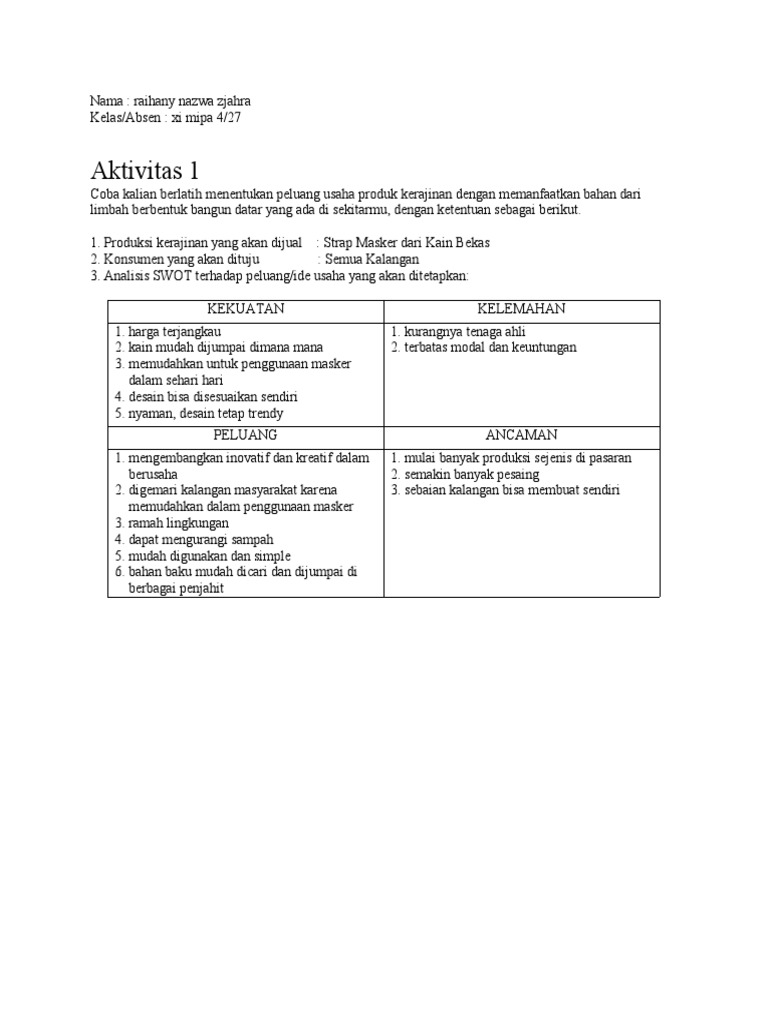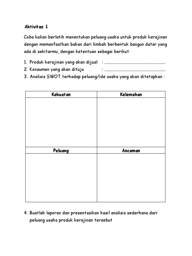 1Ide dan Peluang Usaha Kerajinan dari Bahan. ARTIKEL PRAKARYA DAN KEWIRAUSAHAAN KERAJINAN BANGUN DATAR SMASMK KELAS XI REVISI 2017. Kunci jawaban Aktivitas 1 BAB I Halaman 11 Wirausaha Kerajinan dari Bahan Limbah Berbentuk Bangun datar.