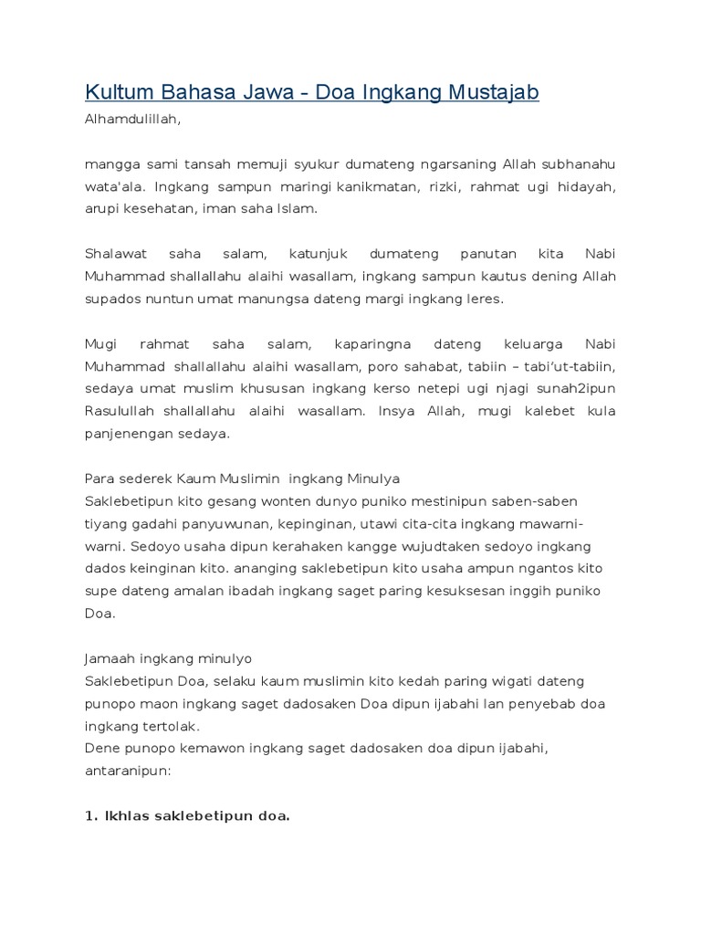 Materi kultum bahasa jawa. Pidato Bahasa Jawa Singkat. Khutbah jumat bahasa jawa Terapi Penyakit Hati contoh KULTUM BAHASA JAWA krama inggil ramadhan sasi pasa siyam puasa poso PENGGUNAAN PERAWATAN ALAT UKUR KHUTBAH JUMAT BAHASA JAWA Prinsip tiang Muslim Ngudi Rizki saha. Poroالسلا م عليكم ورحمة الله وبر كا ته.