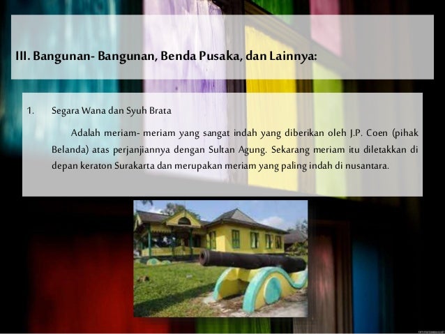 Shavira Tasya 9 May 2020. Meriam Segara Wana dan Syuh Brata Meriam ini merupakan pemberian JP Coen pemimpin militer pihak Belanda. Coen pihak Belanda atas perjanjiannya dengan Sultan Agung.