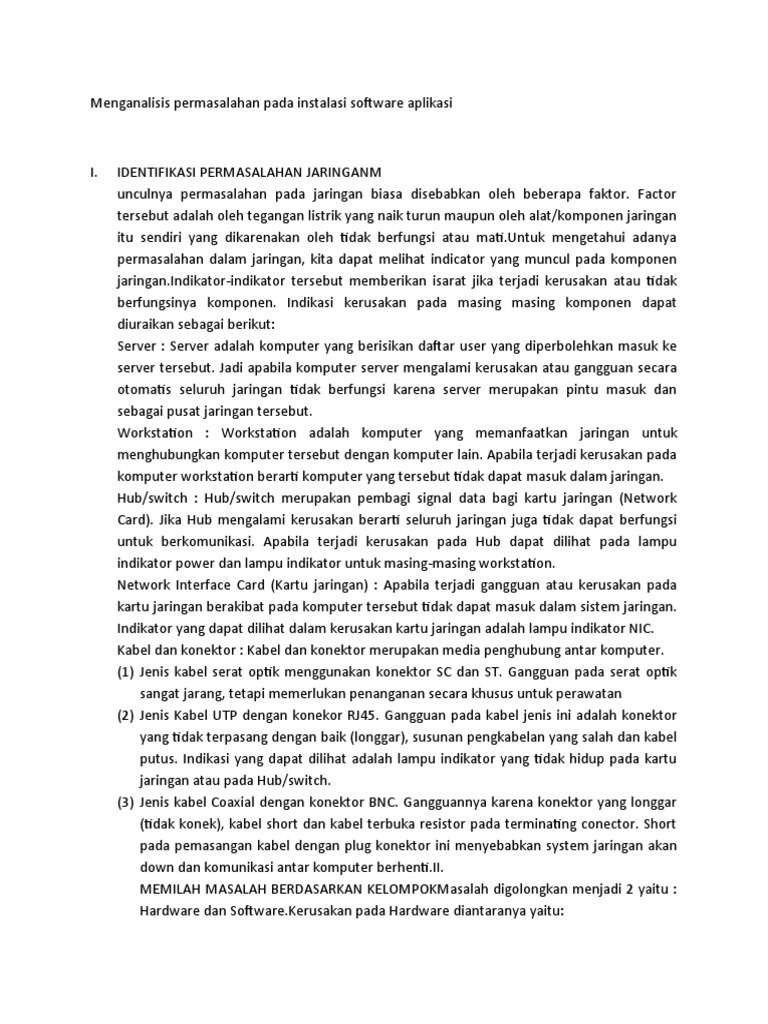 Menganalisis permasalahan pada instalasi software aplikasi. Apa dan Jenis-jenis software Materi Melakukan Instalasi Software. 310 Menganalisis permasalahan pada instalasi software aplikasi 410 Mengelola perbaikan pada instalasi software aplikasi Carilah informasi dari buku atau. 310 Menganalisis permasalahan pada instalasi software aplikasi Permasalahan pada instalasi software aplikasi a Kesalahan setting konfigurasi jaringan.